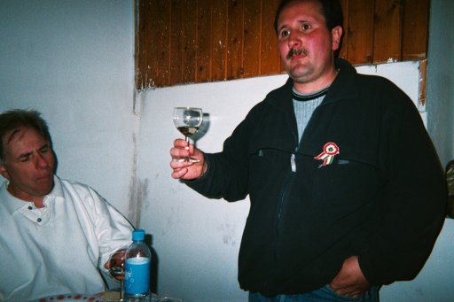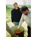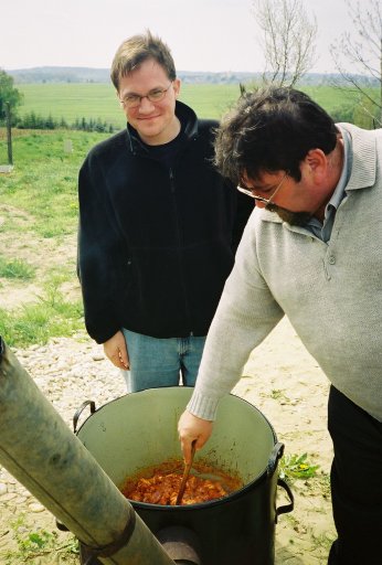 Once in Hungary, our first stop was Csurgó. There we were treated to a tour of some vineyards, a wine tasting, and a goulash feast. Here, Rick is supervising László as he prepares the goulash. |