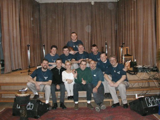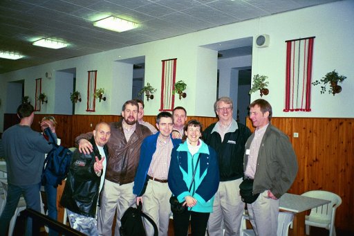 This group shot of us and our hosts was taken after the Tata concert. Front row, from left: Jim, Andris (interpreter), Ildi, Dani (tour guide and driver), Sanyi (driver and mascot), Rick, and Doug; second row: Michael, Chaz, John, Dan; and Greg on top. |
