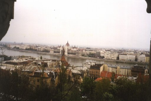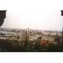 After the concert in Tata, our hosts were off for other obligations, and a substitute crew of hosts drove us back to Balatonfüred. Saturday morning we left Balatonfüred to spend our last day in Hungary in Budapest. Andris and Ildi met us there and played tour guides. This is a view of the Danube from high on the Buda side of the river. |